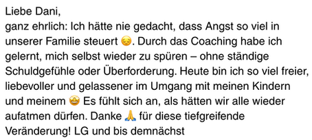 Du weißt, welche Faktoren deine Ängste bedienen und hebelst diese aus und holst dir dein entspanntes und glückliches Familenleben zurück.